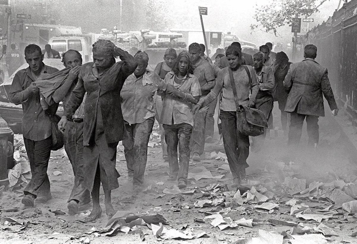 Người dân chạy khỏi khu vực Trung tâm Thương mại Thế giới, bao quanh họ là khói bụi mù mịt.