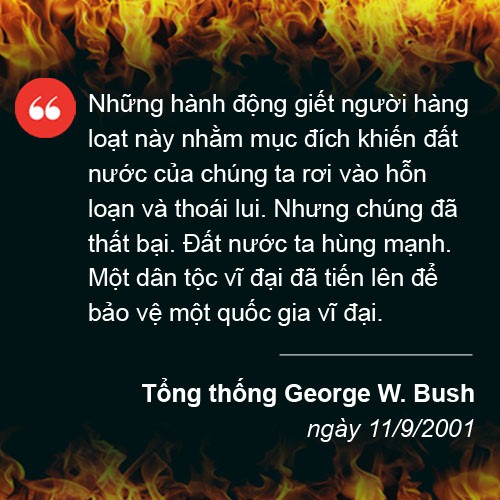 Vào cuối ngày 11/9, khi làn khói bụi mờ mịt vẫn bốc lên từ tòa tháp đôi bị sập ở Vùng Không (Ground Zero), suy nghĩ của người Mỹ về cơ bản đã thay đổi. Mong muốn ngăn chặn một cuộc tấn công khủng bố khác trên đất Mỹ đã đưa Washington vào cuộc chiến kéo dài 20 năm ở Afghanistan, đất nước mà Tổng thống George Bush tuyên bố là nơi che chở cho “kẻ chủ mưu” – mạng lưới khủng bố al-Qaeda. Mỹ cũng tiến hành cuộc xâm lược và lật đổ chính quyền ở Iraq; can thiệp vào cuộc chiến kéo dài ở Syria và tổ chức những vụ ám sát khủng bố trên toàn cầu. Chính sách đối ngoại và quốc phòng của nước Mỹ hướng mục tiêu vào chủ nghĩa Hồi giáo cực đoan. Trung Đông rung chuyển bởi những biến động và bi kịch. Chế độ của Tổng thống Saddam Hussein ở Iraq sụp đổ; Syria lâm vào cuộc nội chiến đầy thương đau cả thập kỷ; khủng bố Nhà nước Hồi giáo (IS) ra đời, trở thành nỗi khiếp sợ của cả thế giới...