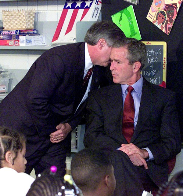 Chánh văn phòng Andrew Card thì thầm vào tai Tổng thống George W. Bush, thông báo “Nước Mỹ bị tấn công”, sáng 11/9/2001.