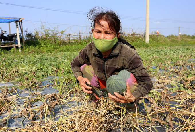 "Vài ngày nữa tôi nhổ lên dọn sạch ruộng chuyển qua trồng lúa vụ tới", bà nói, cho biết vụ dưa này thất thu, mất hơn 20 triệu đồng vốn đầu tư, chưa kể công chăm sóc.