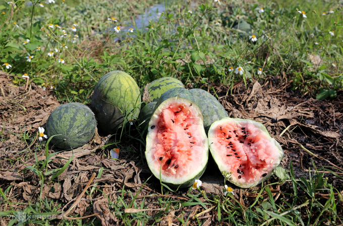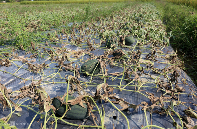 Sau khi ngập nước gặp trời nắng, dưa hấu đã bị chết khô. Ảnh: Đắc Thành