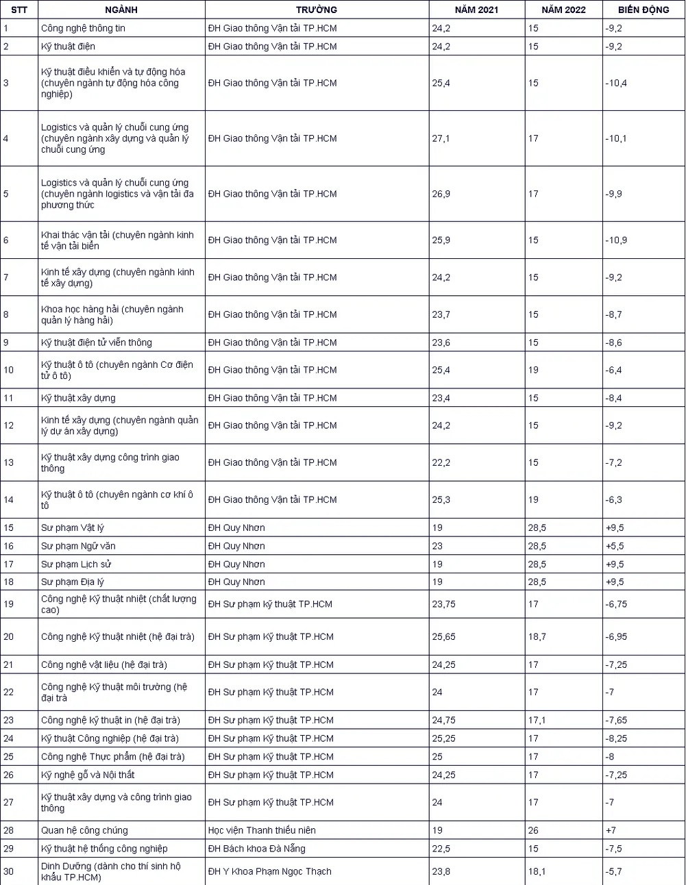 Trong số những trường có điểm chuẩn giảm mạnh, đứng đầu là Trường ĐH Giao thông Vận tải TP.HCM. Rất nhiều ngành trong trường có mức giảm "không tưởng", từ 9 đến gần 11 điểm so với kỳ tuyển sinh năm trước, trong đó có những ngành vốn là thế mạnh của trường.