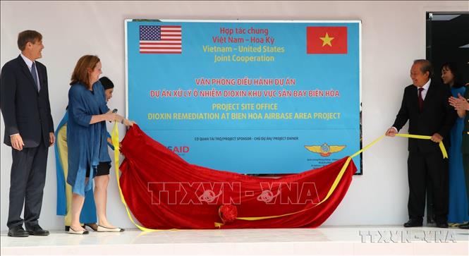 Phó Thủ tướng Thường trực Chính Phủ Trương Hòa Bình cùng Phó Đại sứ Hoa Kỳ tại Việt Nam bà Caryn R.Mc Clelland thực hiện nghi thức khai trương khu làm việc của Ban quản lý dự án xử lý đất ô nhiễm dioxin tại sân bay Biên Hòa