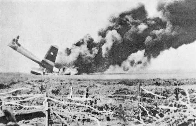 Máy bay B26 của Pháp tại mặt trận Điện Biên Phủ bị lực lượng pháo phòng không 37mm của quân ta bắn rơi. Ảnh: TTXVN.