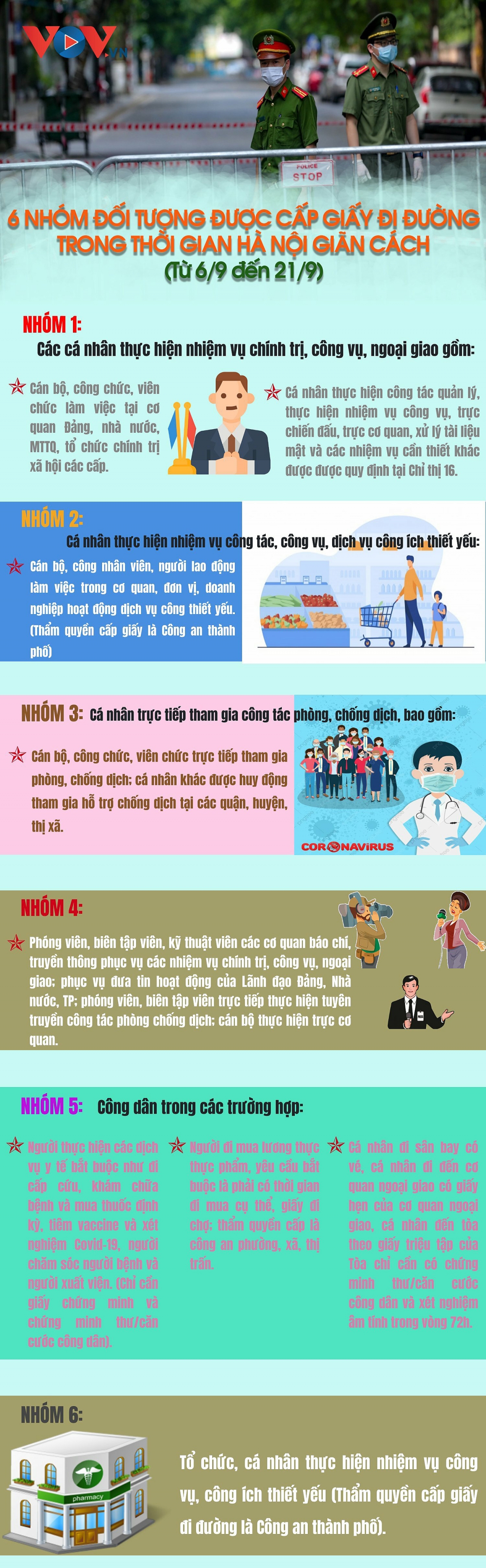 Thành phố Hà Nội quy định có 6 nhóm đối tượng được phép ra đường trong thời gian giãn cách từ 6h ngày 6/9 đến 6h ngày 21/9 tới đây.