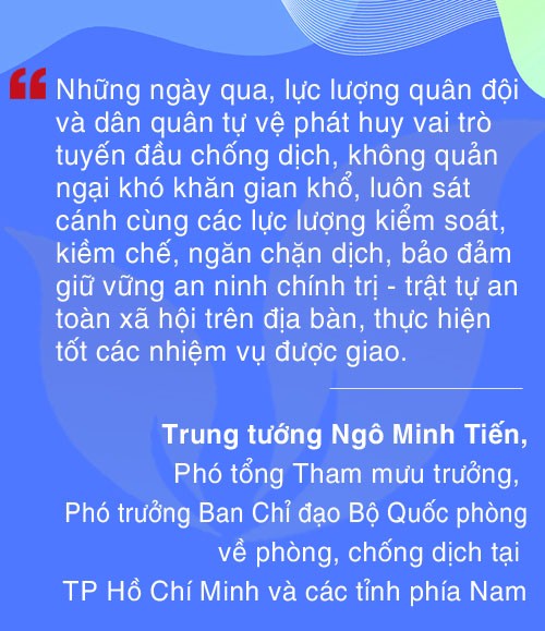 Đánh giá về công tác tham gia phòng, chống dịch của lực lượng quân đội tăng cường tại các địa phương phía Nam, Trung tướng Ngô Minh Tiến, Phó tổng Tham mưu trưởng, Phó trưởng Ban Chỉ đạo Bộ Quốc phòng về phòng, chống dịch tại TP Hồ Chí Minh và các tỉnh phía Nam nhấn mạnh, trong những ngày qua, lực lượng quân đội và dân quân tự vệ phát huy vai trò tuyến đầu chống dịch, không quản ngại khó khăn gian khổ, luôn sát cánh cùng các lực lượng kiểm soát, kiềm chế, ngăn chặn dịch, bảo đảm giữ vững an ninh chính trị - trật tự an toàn xã hội trên địa bàn, thực hiện tốt các nhiệm vụ được giao.