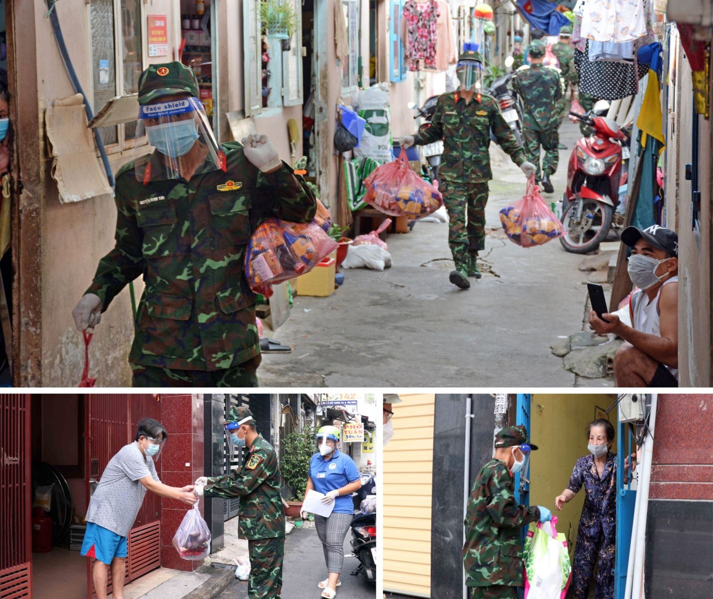 Các chiến sĩ bộ đội tham gia hoạt động hỗ trợ người dân tại tâm dịch TP Hồ Chí Minh.