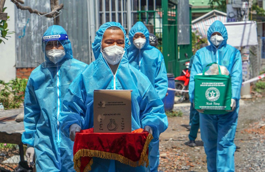 Từ ngày 8/8, trước tình hình thực tế có những người qua đời vì COVID-19 mà người thân không thể có mặt ngay để lo hậu sự, Bộ Tư lệnh TP Hồ Chí Minh đã thành lập các tổ công tác đặc biệt giúp đỡ người dân thực hiện công việc nghĩa tình này. Đội công tác thay mặt gia đình thực hiện việc chăm sóc chu toàn cho người mất từ khâu khâm liệm đến lúc bàn giao tro cốt cho thân nhân người đã khuất.