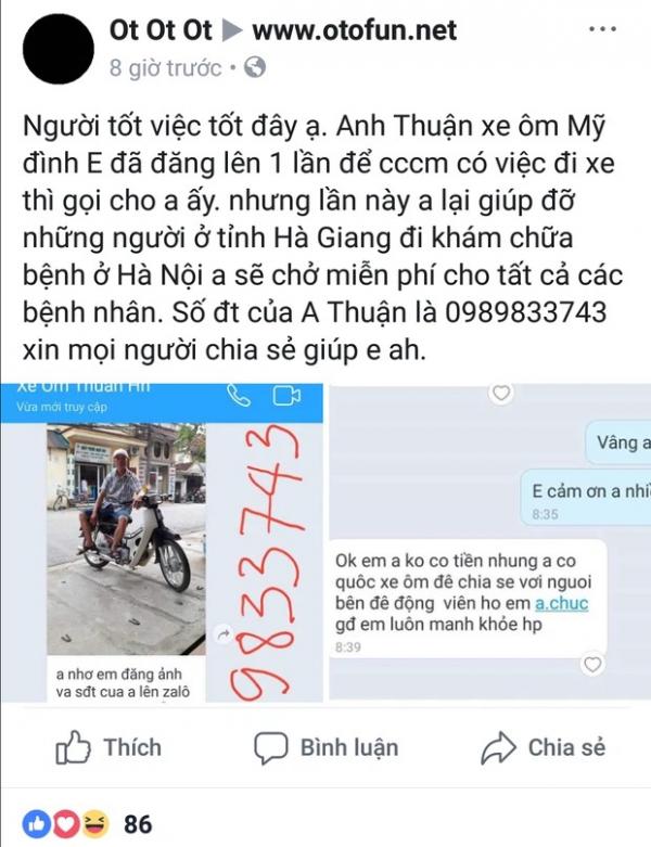 Một người dùng Facebook đã đăng lên mạng xã hội bài viết với nội dung: "Người tốt việc tốt, anh Thuận xe ôm Mỹ Đình nhận chở miễn phí cho tất cả các bệnh nhân từ Hà Giang xuống Hà Nội khám chữa bệnh", cùng với dòng trạng thái là số điện thoại của anh Thuận để ai cần thì liên hệ.