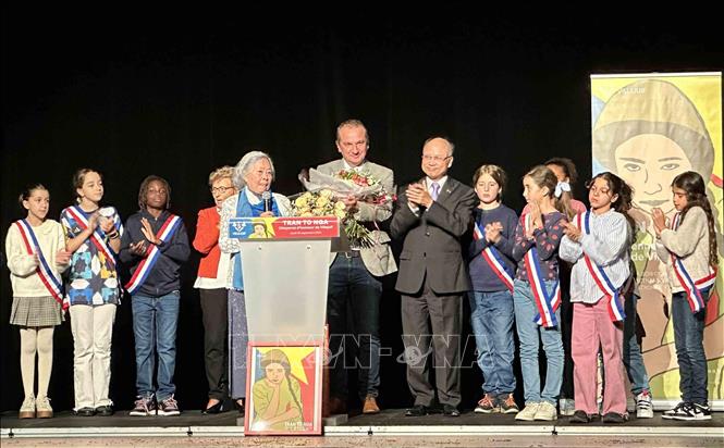Quang cảnh lễ trao tặng danh hiệu “Công dân danh dự của Villejuif” cho bà Trần Tố Nga.