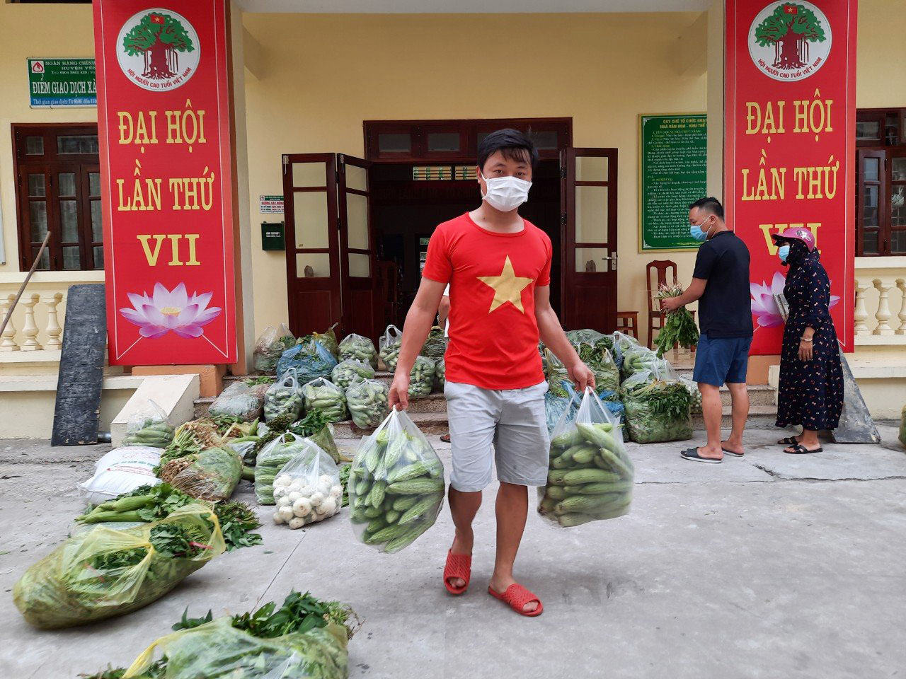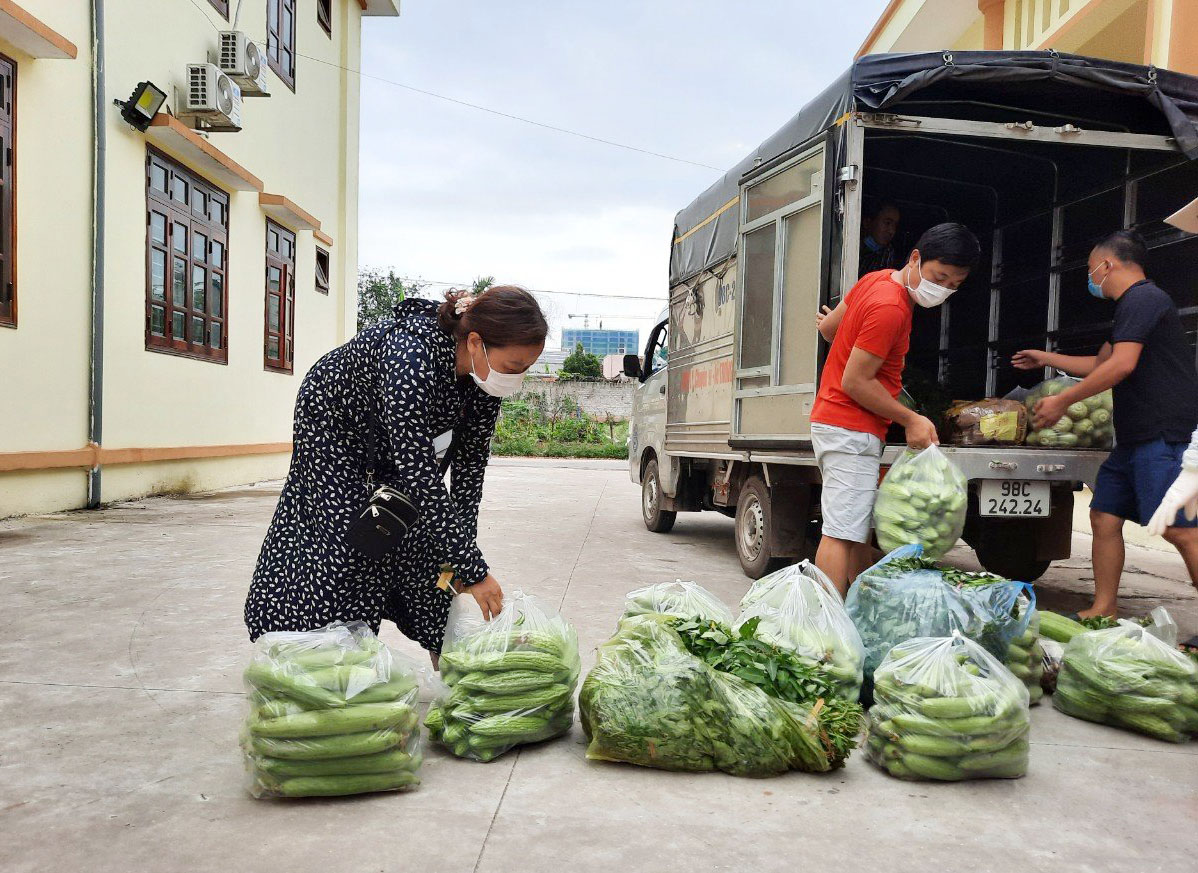 Mẹ con bà Thân Thị Thạo tiếp nhận rau xanh từ các nhà hảo tâm và vận chuyển về trụ sở UBND xã Nội Hoàng để chế biến, phục vụ lực lượng làm nhiệm vụ chống dịch.
