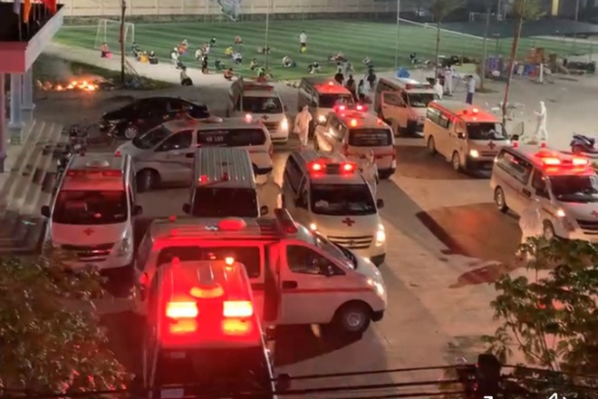 Đoàn xe cứu thương di chuyển hàng nghìn công nhân ra khỏi ổ dịch xã Quang Châu, huyện Việt Yên trong đêm