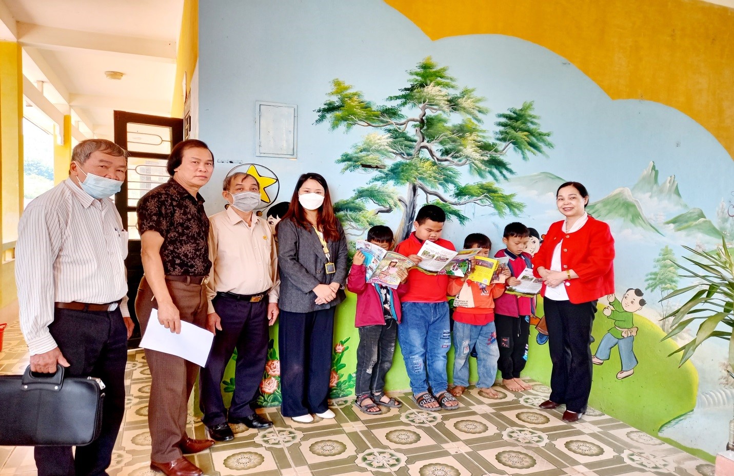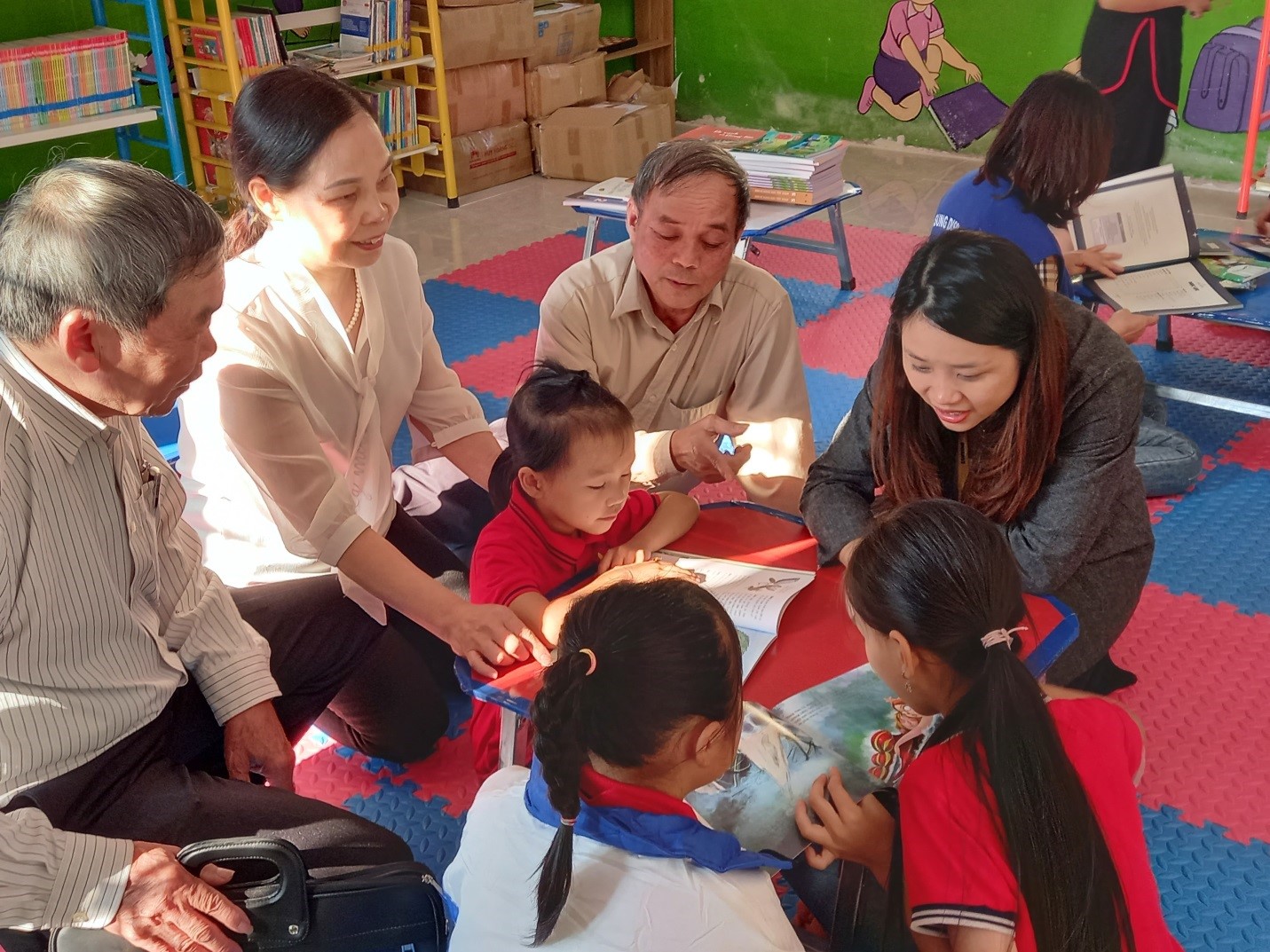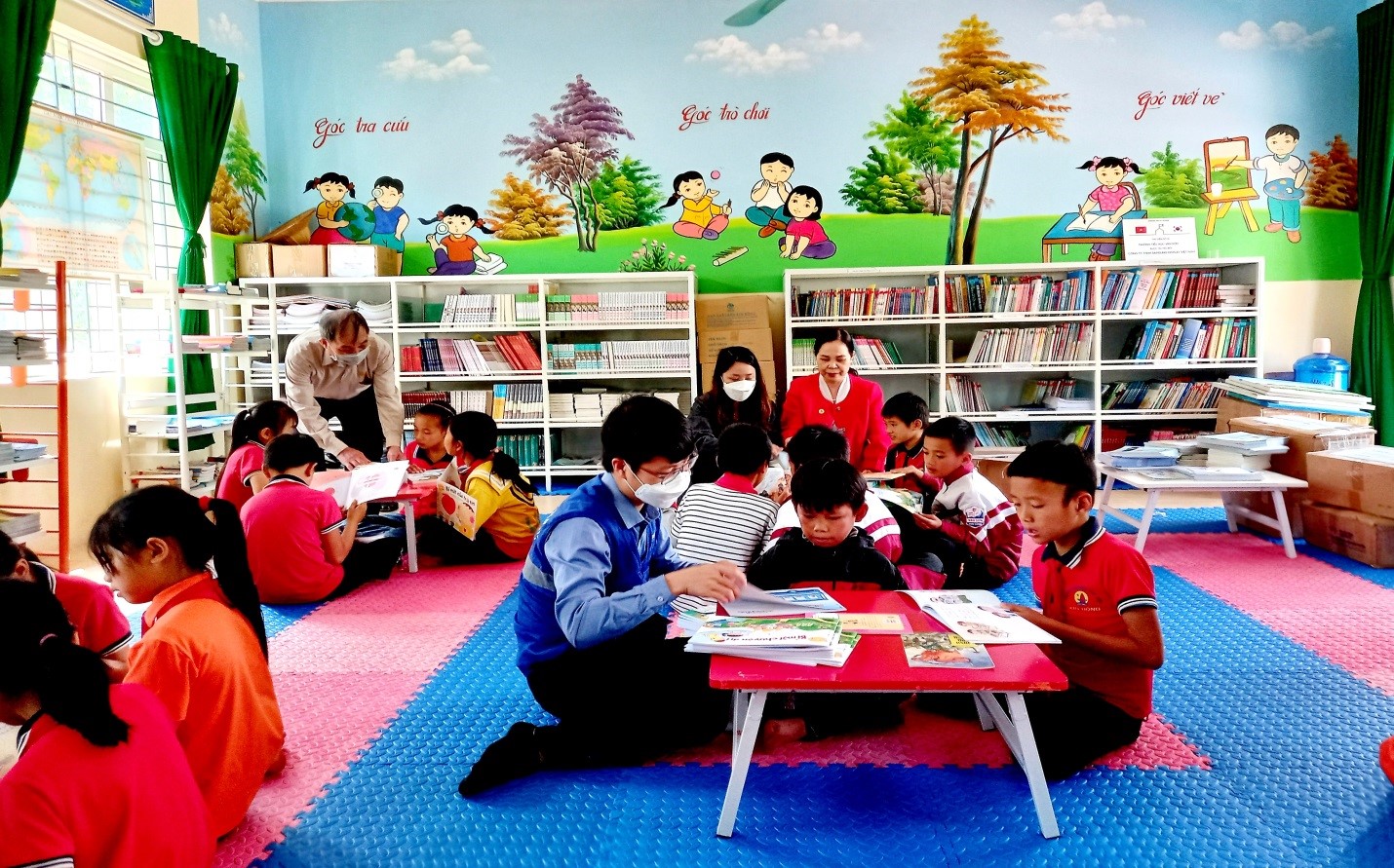 Thường trực Tỉnh hội, Huyện hội và Nhà tài trợ cùng trò chuyện, hướng dẫn các em học sinh Trường Tiểu học An Lạc, Vân Sơn đọc truyện tranh