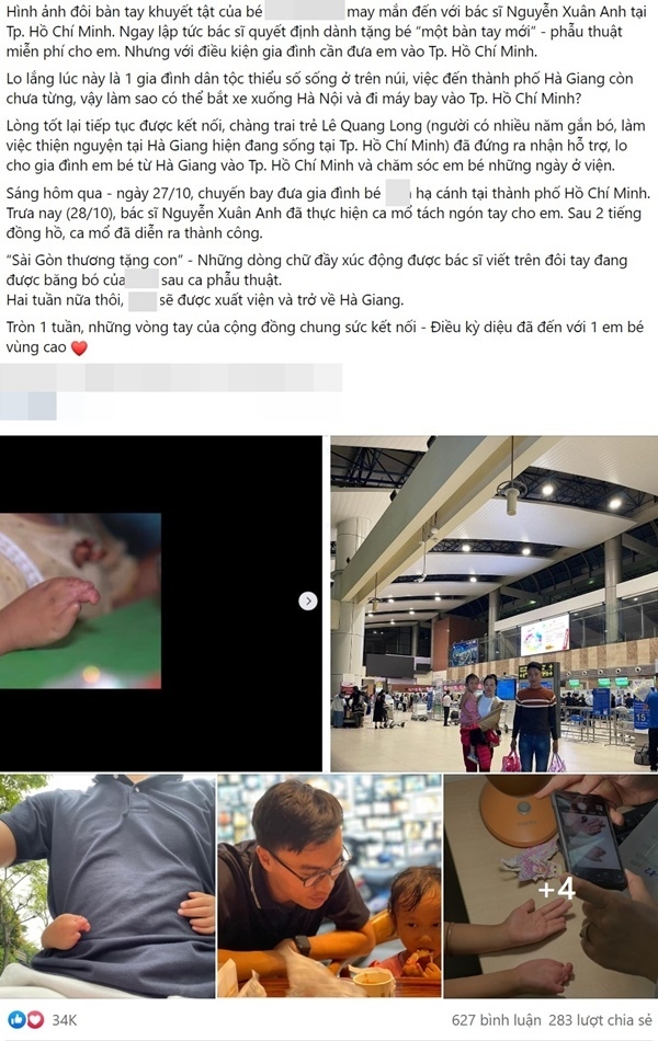 Không chỉ "tặng" bé gái một bàn tay mới hoàn chỉnh, bác sĩ Xuân Anh còn hỗ trợ mọi chi phí. Dù vậy, anh vẫn khiêm tốn viết dòng chữ: "Sài Gòn thương tặng em" lên phần băng bó tay. Anh không nhận công lao ấy một mình mà muốn bé gái được cả cộng đồng quan tâm.