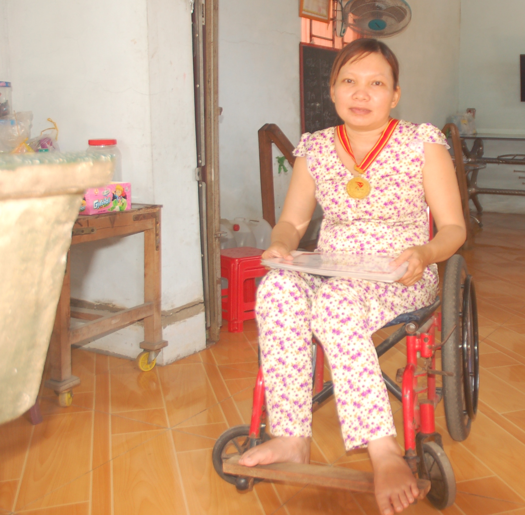 Đỗ Thị Khuyên trên chiếc xe lăn trước nhà.
