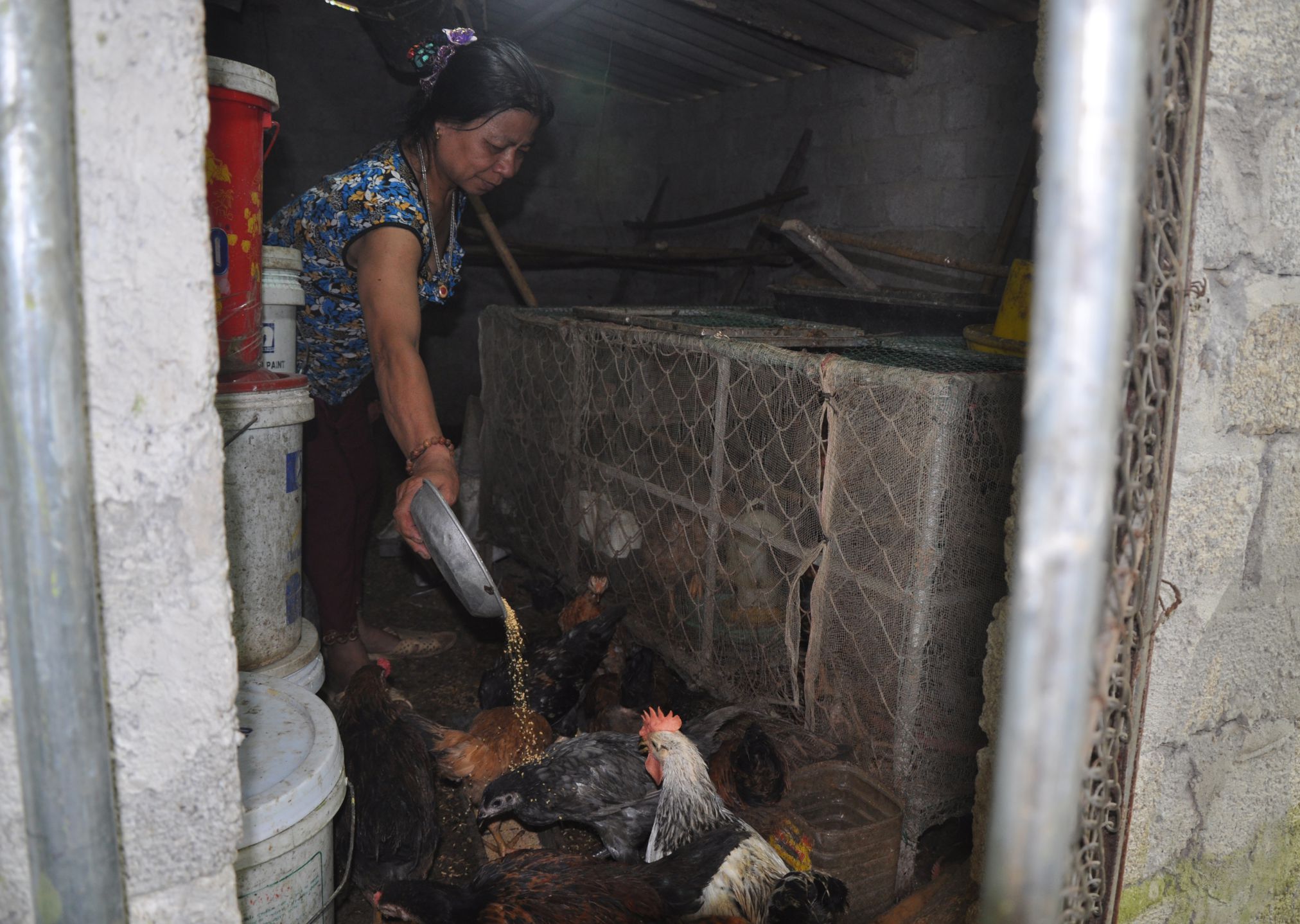 Bà Nguyễn Thị Năm chăm sóc đàn gà để có thêm thu nhập
