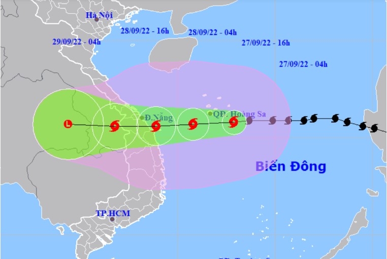 Đến 16h ngày 27/9, vị trí tâm bão cách Đà Nẵng khoảng 300km, Quảng Nam khoảng 250km, Quảng Ngãi khoảng 240km về phía Đông. Sức gió mạnh nhất vùng gần tâm bão mạnh cấp 14-15 (150-183km/giờ), giật cấp 17.
