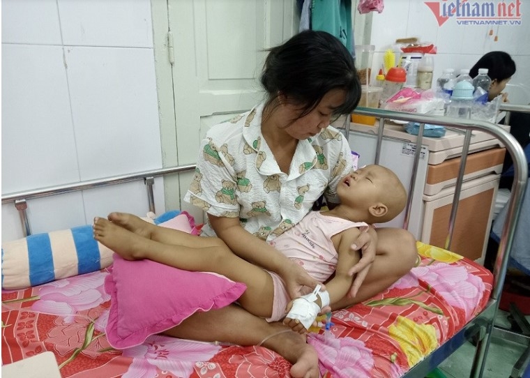 | Bé Bảo Anh gào khóc vì đau đớn, trên tay con vẫn đang cắm kim truyền thuốc hóa chất. |