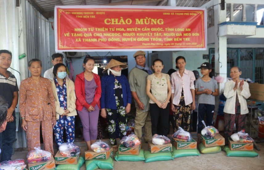 Ngày 06/12/2020, tại ấp Quý Điền A, xã Thạnh Phú Đông, huyện Giồng Trôm tỉnh Bến Tre, Hội NNCĐDC/dioxin - BVQTE tỉnh Bến Tre tặng 100 suất quà cho NNCĐDC, người khuyết tật có hoàn cảnh nghèo, khó khăn ở 2 ấp Quý Điền A, Quý Điền B, xã Thạnh Phú Đông. Mỗi phần quà trị giá 300 ngàn đồng gồm: gạo, mì tôm, đường, nước tương, nước mắm, hạt niêm và một số nhu yếu phẩm, với tổng số tiền là 30 triệu đổng. Đây là quà do ông Tư Hoa - Nhóm Từ thiện “Tư Hoa” huyện Cần Giuộc, tỉnh Long An tài trợ.