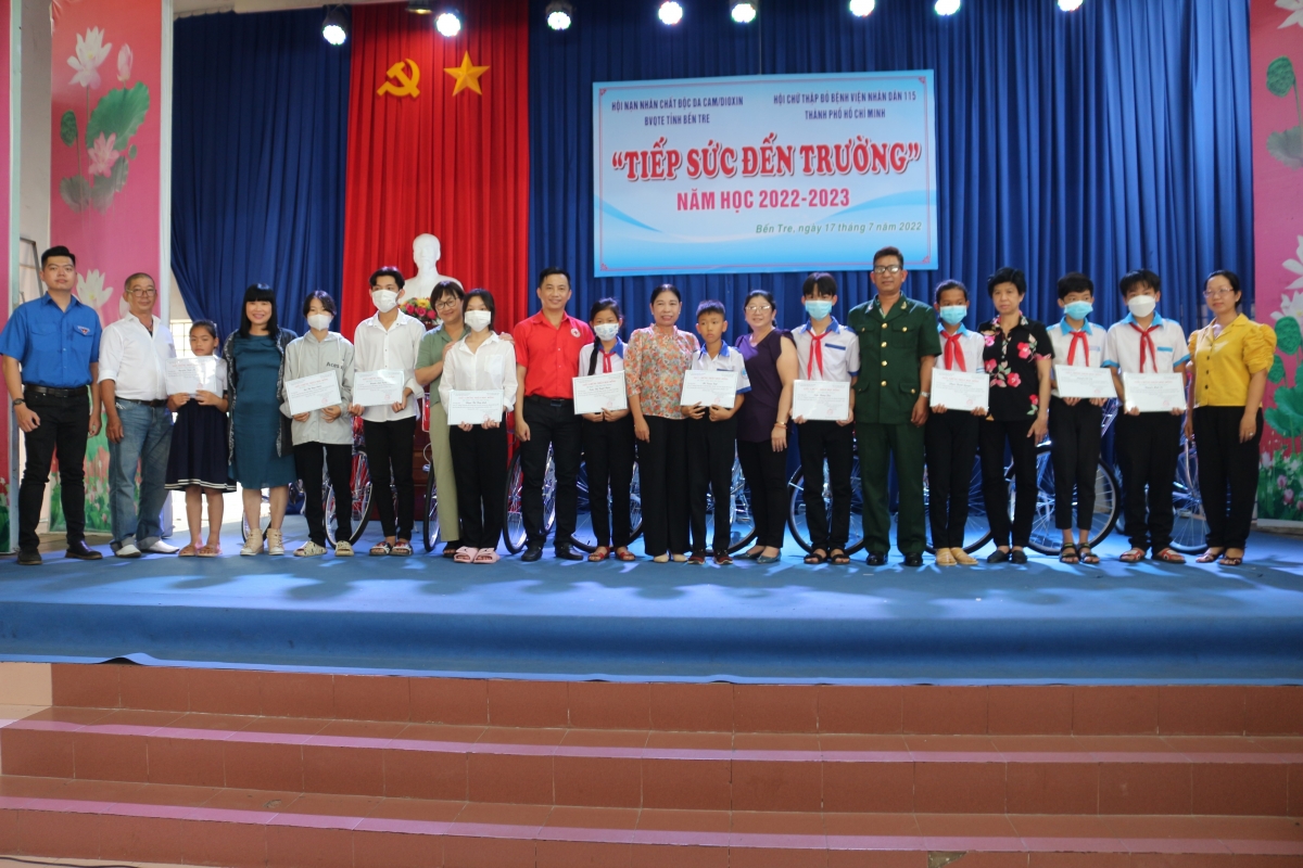 Nhằm đồng hành và chia sẻ tiếp sức cho các em học sinh, sinh viên nghèo, mồ côi, khuyết tật có thêm điều kiện đến trường năm học 2022-2023, ngày 17/7/2022 tại tỉnh Bến Tre, Hội NNCĐDC/dioxin - BVQTE tỉnh Bến Tre phối hợp Hội Chữ thập đỏ của Bệnh viên Nhân dân 115 Thành phố Hồ Chí Minh tổ chức chương trình tiếp sức đến trường năm học 2022-2023.