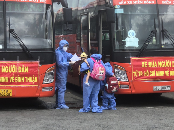 Đoàn xe đón 300 người dân Bình Thuận xuất phát tại bến xe miền Đông, TP.HCM về quê. Đây là đợt thứ 2 mà tỉnh Bình Thuận thực hiện những chuyến xe đón người dân đang gặp khó khăn ở vùng dịch về quê .