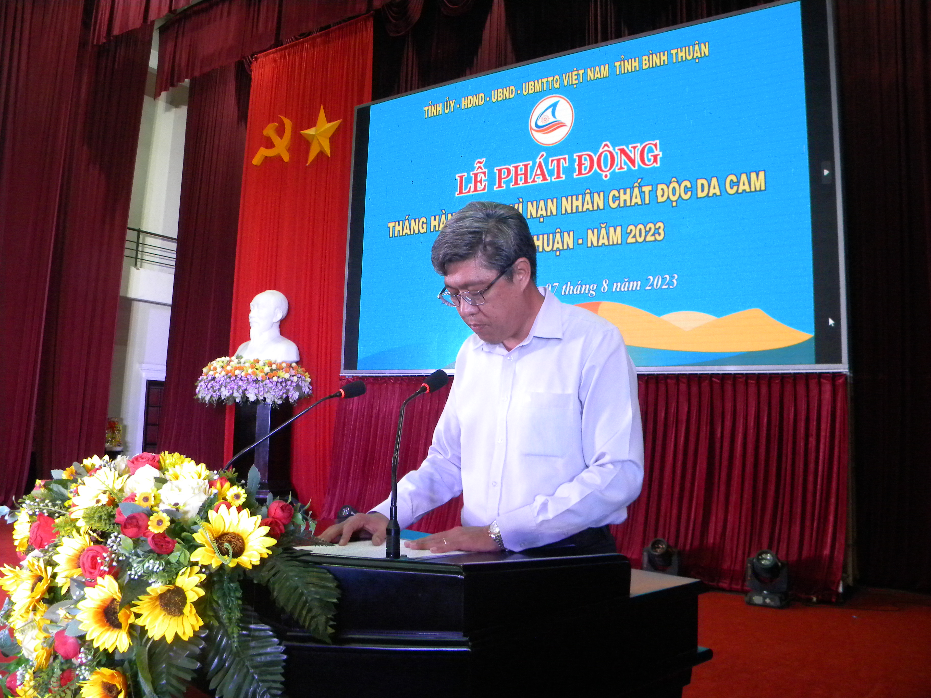 Bài phát biểu nhấn mạnh: "Trong cuộc chiến tranh xâm lược Việt Nam, quân đội Mỹ không chỉ dùng các loại vũ khí tối tân mà còn dùng cả vũ khí hóa học để hủy hoại môi trường sống và sức khỏe con người Việt Nam gây nên thảm họa da cam rất nặng nề. Tại Bình Thuận qua điều tra, khảo sát sơ bộ, quân đội Mỹ đã phun rải trực tiếp xuống 166.472 ha, chiếm 21% diện tích đất đai toàn tỉnh. Với 565.462 ga lông chất độc hóa học (mỗi ga lông = 5,546 lít); trong đó chất da cam chiếm 74,1%, còn lại là chất xanh và chất trắng và các chất độc khác. Có gần 6.000 người bị nhiễm và phơi nhiễm chất độc da cam. Hầu hết những người bị nhiễm chất độc da cam là cán bộ kháng chiến, là bộ đội, thanh niên xung phong, dân công hỏa tuyến và nhân dân sống trong vùng bị phun rải chất độc….. Các nạn nhân mang trong mình căn bệnh hiểm nghèo, di truyền sang đời con, cháu. Trong số họ có nhiều cảnh ngộ bi đát, tuyệt vọng vì bệnh tật giày vò, những gia đình có nhiều nạn nhân càng rơi vào cảnh khó khăn, kiệt quệ.– Nỗi đau của các nạn nhân chất độc da cam là nỗi đau chung của cả dân tộc. Công tác giải quyết hậu quả chất độc hóa học do Mỹ sử dụng trong chiến tranh Việt Nam đối với môi trường sinh thái và sức khỏe con người là vấn đề vừa cấp bách, vừa lâu dài, là trách nhiệm của cấp ủy Đảng, chính quyền của các cán bộ, đảng viên và các tổ chức trong hệ thống chính trị.