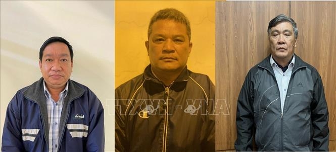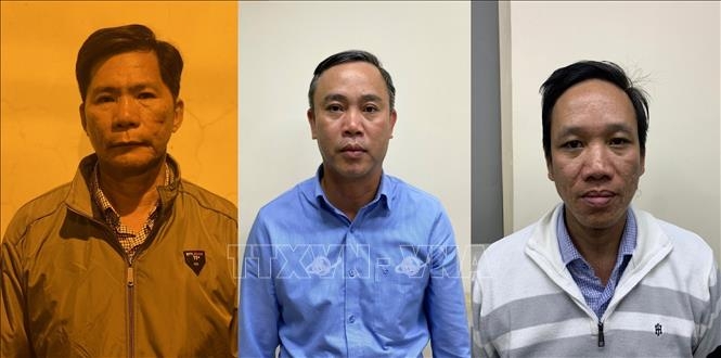 | Các bị can (từ trái qua phải): Lê Anh Huy, Phạm Duy Cường; Nguyễn Văn Phong. Ảnh: TTXVN |