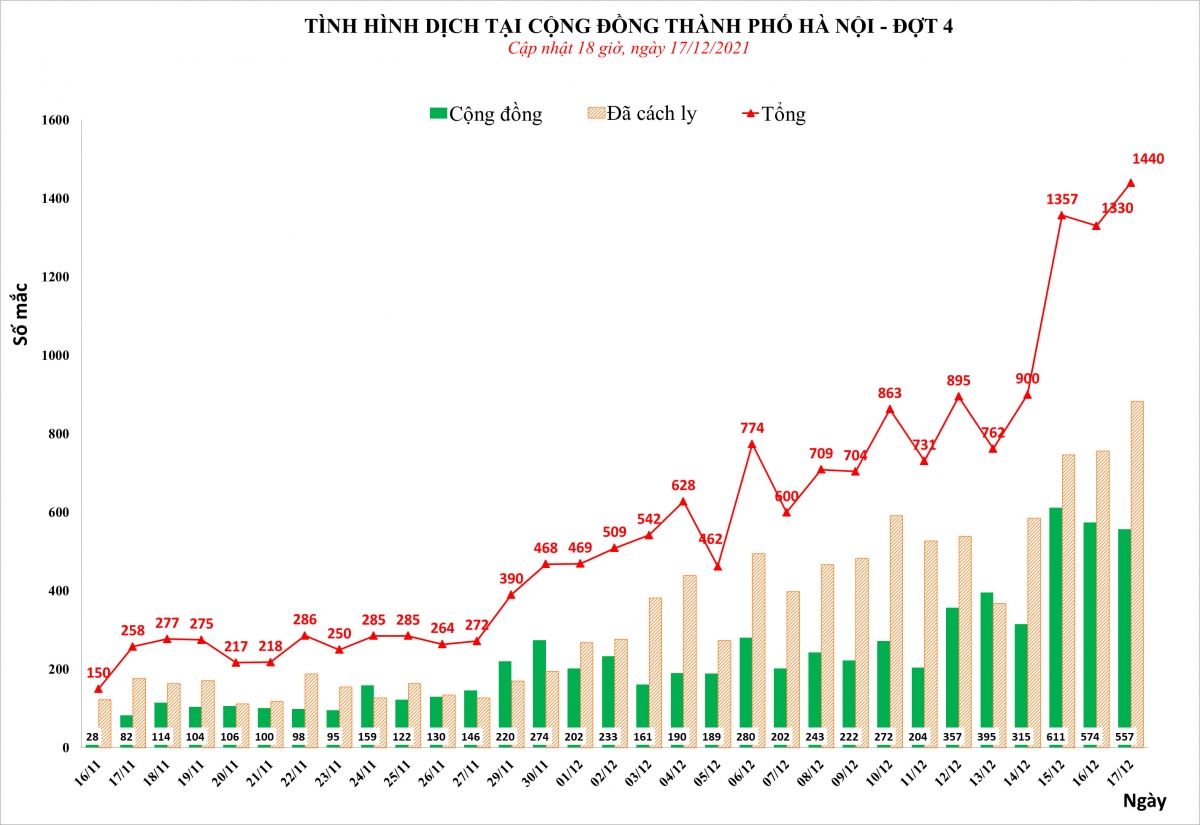 Ngày 17/12, Hà Nội có thêm 1.440 ca COVID-19, trong đó có 557 ca cộng đồng và 883 ca trong khu cách ly, phong tỏa. Sở Y tế Hà Nội vừa có hướng dẫn quy trình triển khai chương trình sử dụng thuốc kháng virus (Molnupiravir) có kiểm soát tại cộng đồng cho người mắc COVID-19 thể nhẹ. Điều này nhằm bảo đảm quản lý tốt thuốc đến đúng bệnh nhân, tránh thất thoát, tiêu cực, lãng phí trong quá trình sử dụng thuốc.