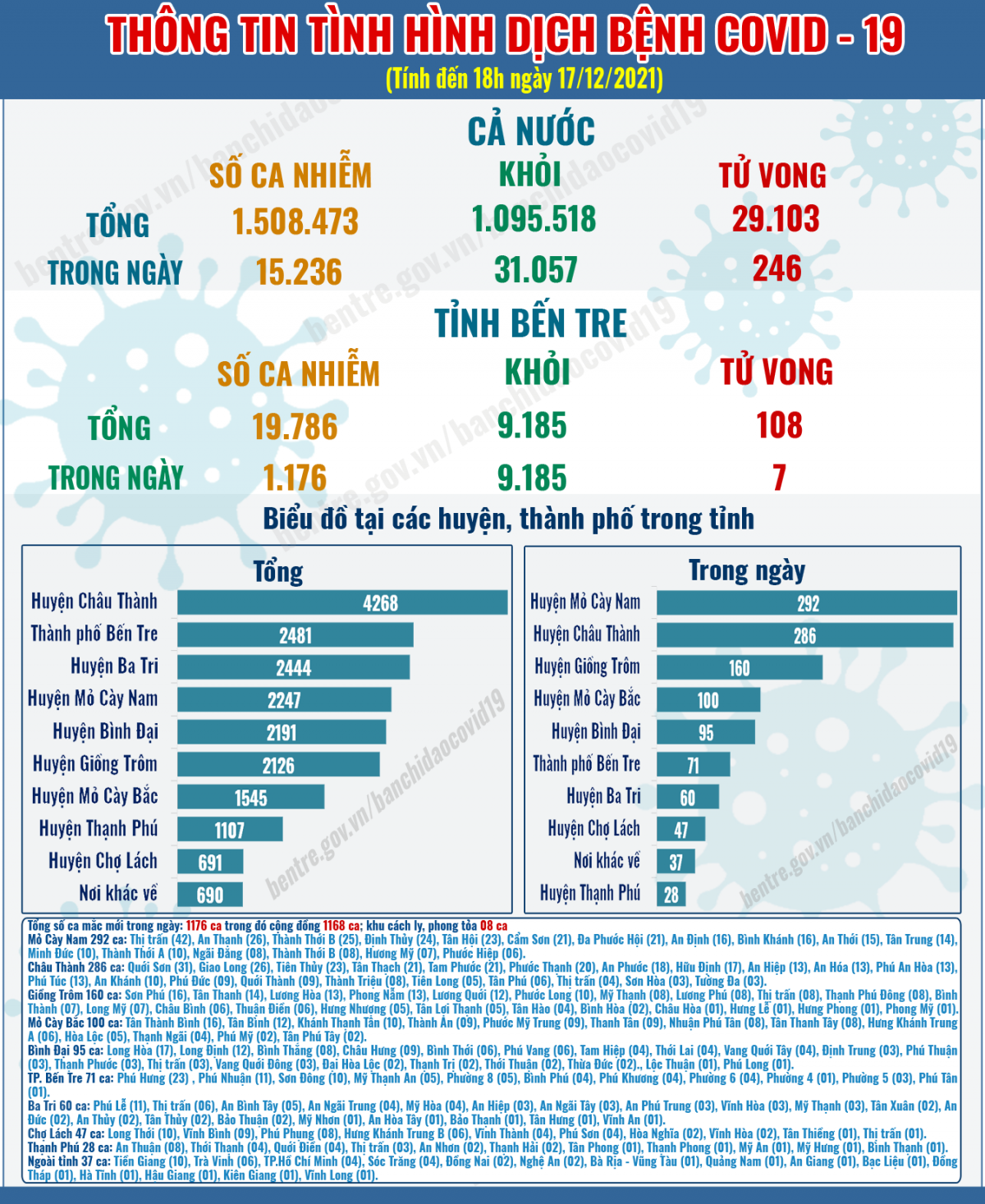 Ngày 17/12, trên Hệ thống Quốc gia quản lý ca bệnh COVID-19 ghi nhận 1.246 ca mắc COVID-19 mới tại tỉnh Bến Tre. Bến Tre cũng là địa phương ghi nhận số ca nhiễm tăng cao nhất so với ngày trước đó, với 486 ca.