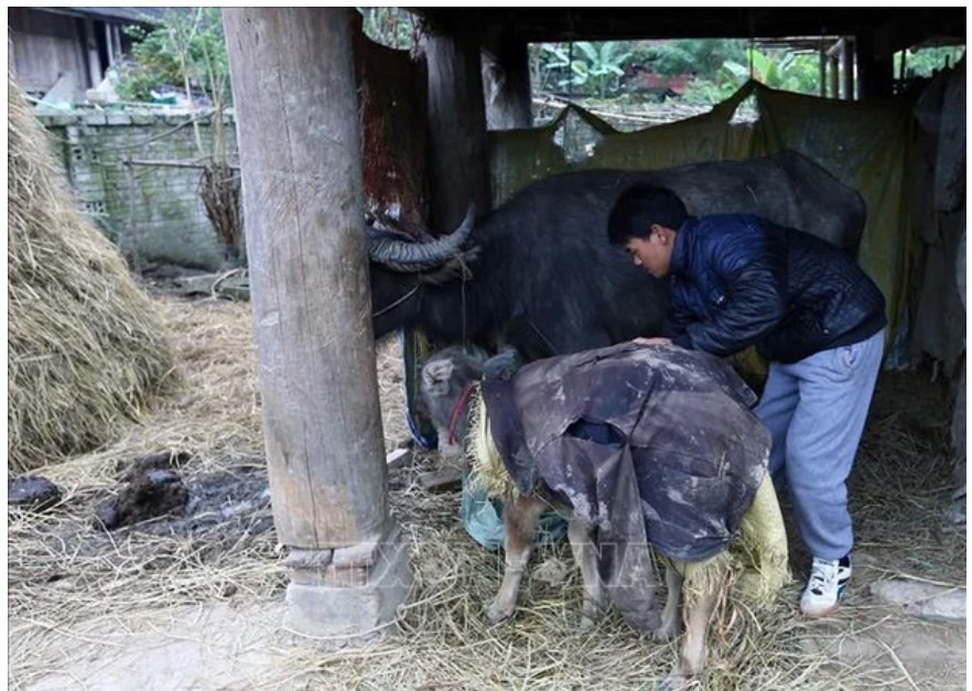 | Người dân giữ ấm cho gia súc trong đợt rét đậm, rét hại. Ảnh tư liệu: Phan Tuấn Anh/TTXVN |