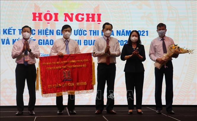 Kết thúc hội nghị, Cụm trưởng thi đua năm 2021 Kiên Giang trao cờ luân lưu cho Cụm trưởng thi đua năm 2022 là Đồng Tháp và 12 tỉnh ký kết giao ước thi đua năm 2022.