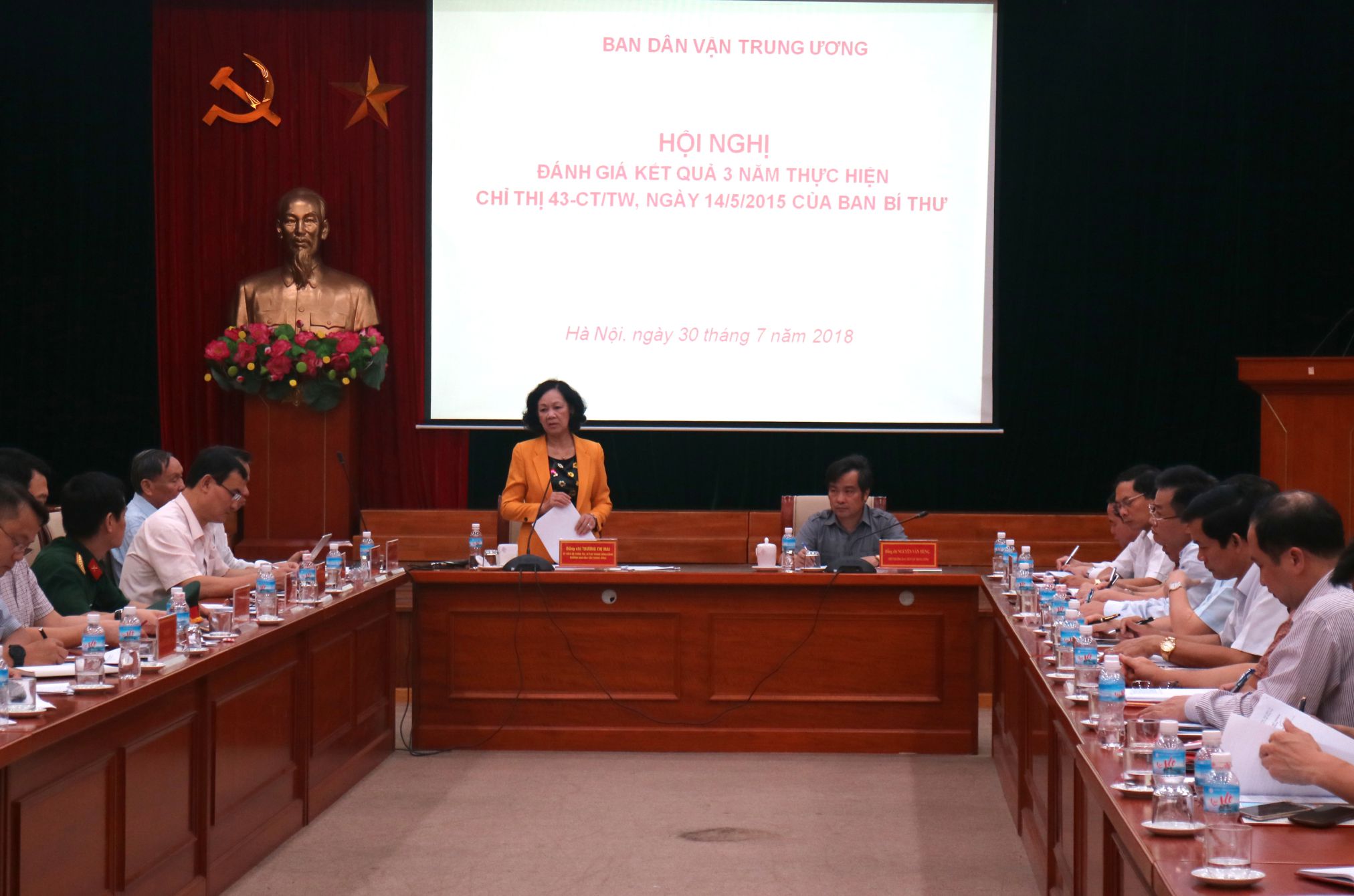 Đồng chí Trương Thị Mai, Ủy viên Bộ Chính trị, Bí thư Trung ương Đảng, Trưởng ban Dân vận Trung ương chủ trì Hội nghị đánh giá kết quả 3 năm thực hiện Chỉ thị 43-CT/TW