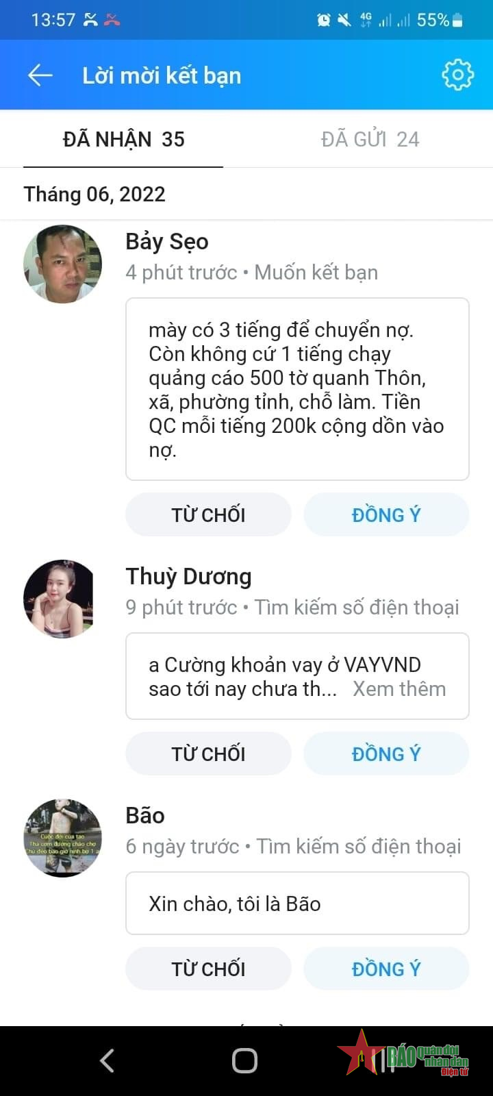 Chị Ngô Minh Hương ở TP Hải Dương (tỉnh Hải Dương) chia sẻ: “Vừa qua, tôi bị nhiều số điện thoại thường xuyên gọi điện, nhắn tin đe dọa vào lúc nghỉ trưa, nửa đêm để đòi khoản nợ của một người thân. Mỗi ngày họ gọi hàng chục cuộc điện thoại, chặn số này thì lại có số khác gọi đến. Sau khi xác minh, tôi thấy khoản nợ này không có thực nên đã nhắn tin nói rõ, nhưng đối tượng khẳng định có khoản nợ đó và tiếp tục làm phiền, ảnh hưởng đến cuộc sống, công việc của tôi”.