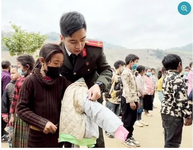 | Trung úy Dương Hải Anh trong những lần thiện nguyện hỗ trợ các em học sinh miền núi tỉnh Sơn La. Ảnh: NVCC |