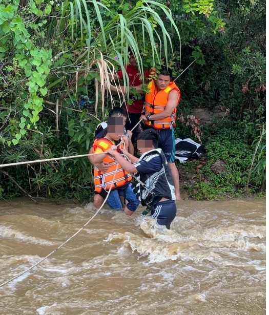 Thời điểm này, do nước chảy siết và địa hình không có cây đủ chắc chắn để buộc dây cố định, nên các chiến sĩ cứu nạn cứu hộ phải tự giữ dây để tiếp cận khu vực các nạn nhân bị mắc kẹt.