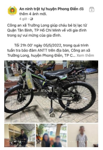 Ngày 6/5, trên trang Fanpage An ninh trật tự huyện Phong Điền đã đăng tải thông tin cho biết, lực lượng Công an xã Trường Long, huyện Phong Điền, Thành phố Cần Thơ giúp đỡ một bé trai về với gia đình khi đi lạc từ quận Tân Bình, TP.HCM đến xã Trường Long.