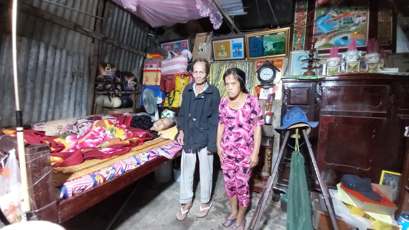 Ông Trần Minh Châu cùng vợ và con gái trước khi vợ ông mất vào đầu năm 2021 trong khu vực sinh hoạt chính, vừa là nơi để ngủ và “tiếp khách”, có nền xi măng bốc mùi ẩm mốc, đồ đạc chất chồng ngổn ngang.