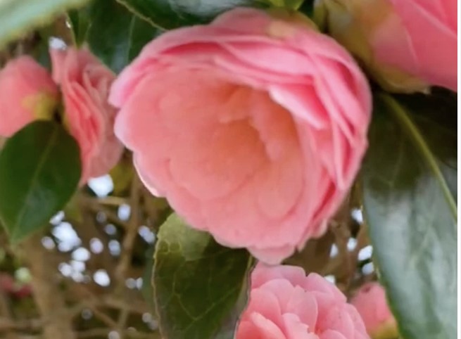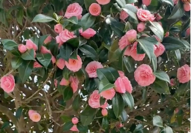 Cây hoa trà của chủ video có tán cao hơn 2 mét, hoa ra xếp tầng, phủ kín. Từng bông hoa còn lồng ghép nhiều lớp cánh, chuẩn chỉnh của hoa trà đẹp.