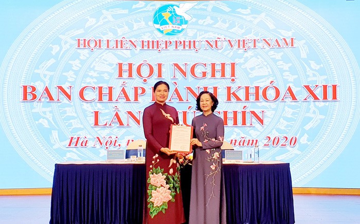 | Tại Hội nghị lần thứ 9 Ban Chấp hành Trung ương Hội LHPN Việt Nam khóa XII ngày 8/5, ông Hà Ban, Ủy viên Trung ương Đảng, Phó Trưởng Ban Tổ chức Trung ương công bố quyết định của Bộ Chính trị điều động, chỉ định bà Hà Thị Nga - Phó Bí thư Thường trực Tỉnh ủy Lào Cai giữ chức Bí thư Đảng đoàn Hội LHPN Việt Nam và giới thiệu bà Hà Thị Nga tham gia Ban Chấp hành, Đoàn Chủ tịch, giữ chức Chủ tịch Hội LHPN Việt Nam nhiệm kỳ 2017-2020. Trong ảnh: Bà Trương Thị Mai - Ủy viên Bộ Chính trị, Bí thư Trung ương Đảng, Trưởng Ban Dân vận Trung ương trao Quyết định của Bộ Chính trị cho bà Hà Thị Nga. |