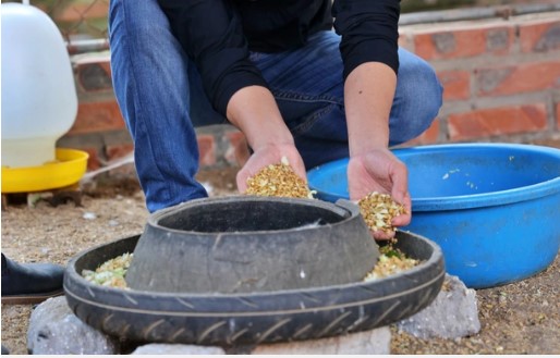 Thức ăn với chim công rất đơn giản gồm các ngũ cốc như thức ăn gà. Bên cạnh đó, anh Phương cho ăn thêm rau, giá đỗ và bổ sung một chút thị bò vào mùa sinh sản.