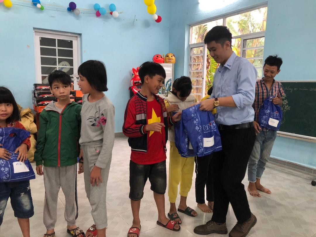Anh Hứa Hoàng Nam – Trưởng phòng Tổ chức hành chính nhân sự Chi nhánh Kinh doanh Biti's Miền Trung tặng Giày cho các em NNCĐ da cam tại Trung tâm