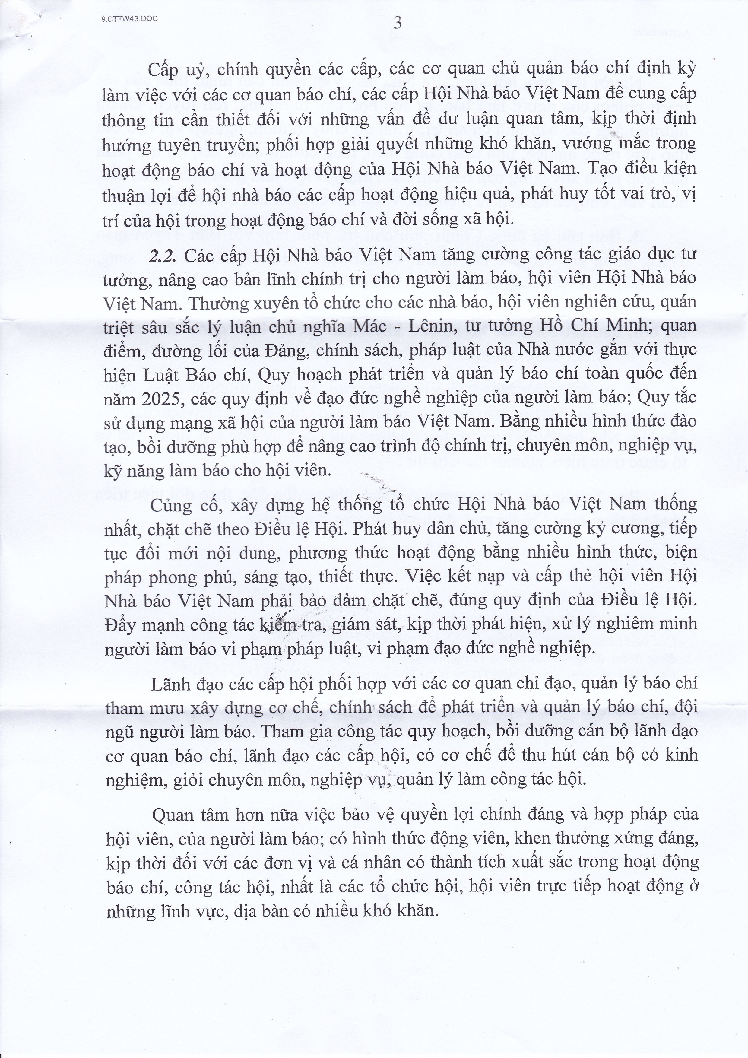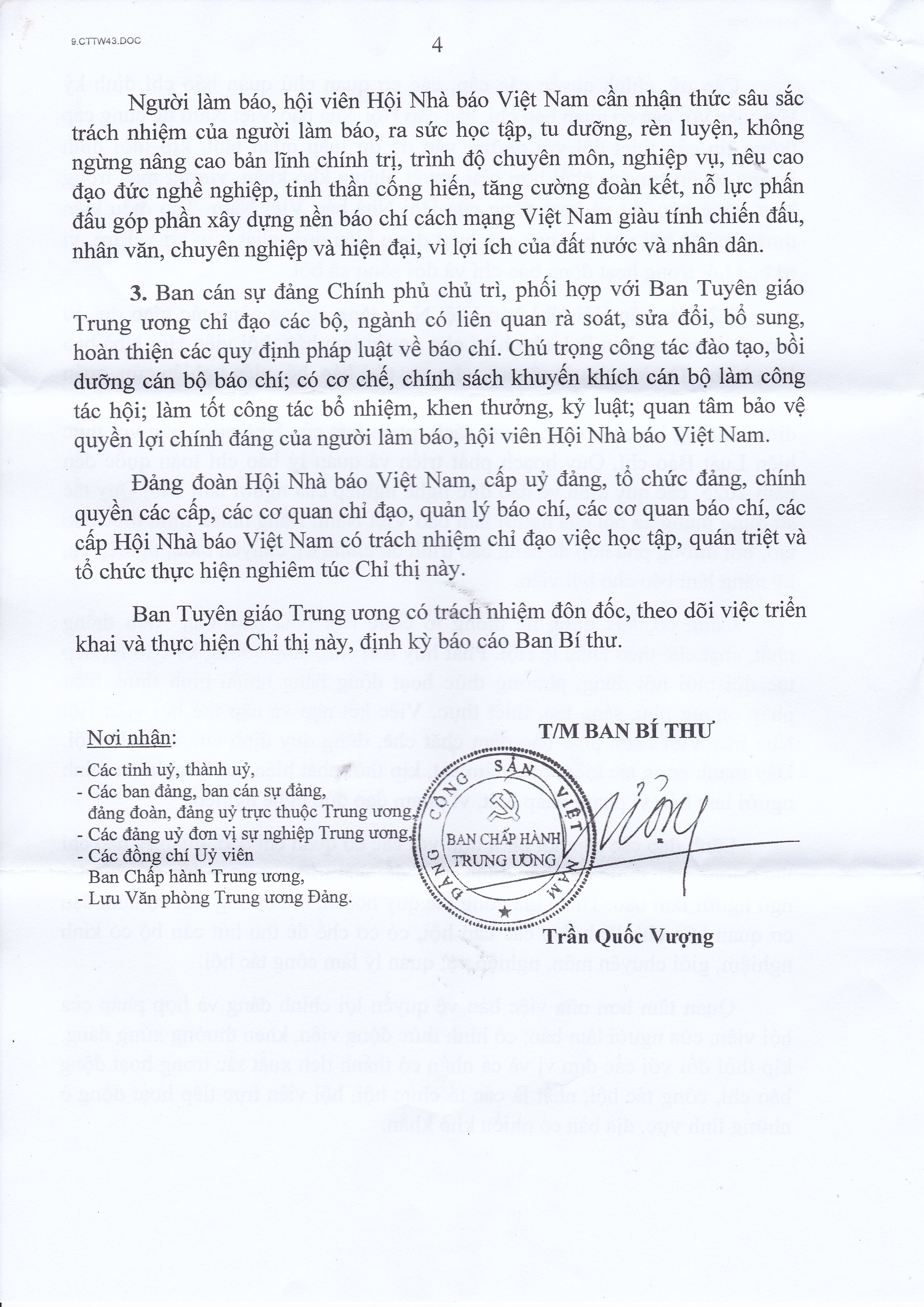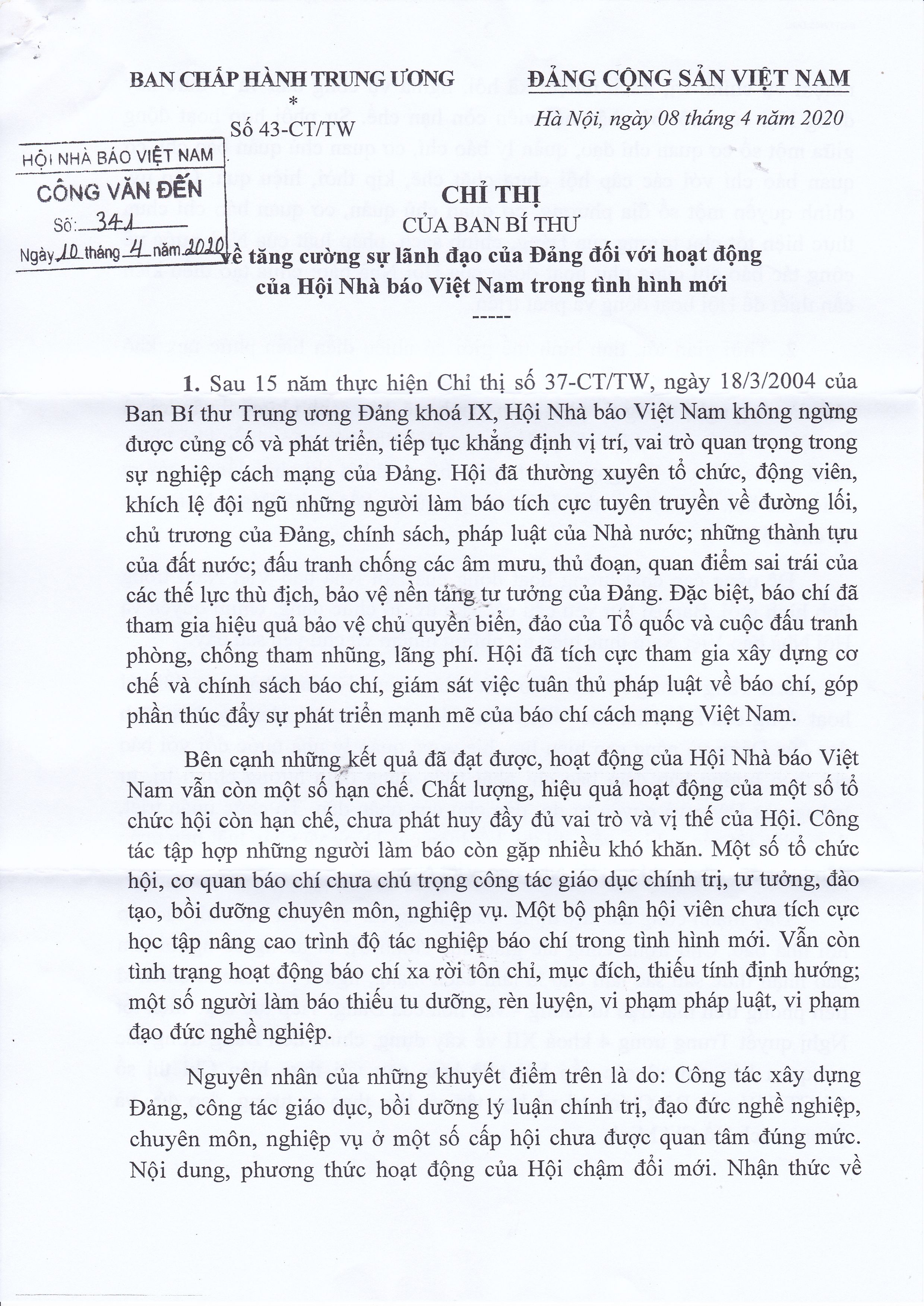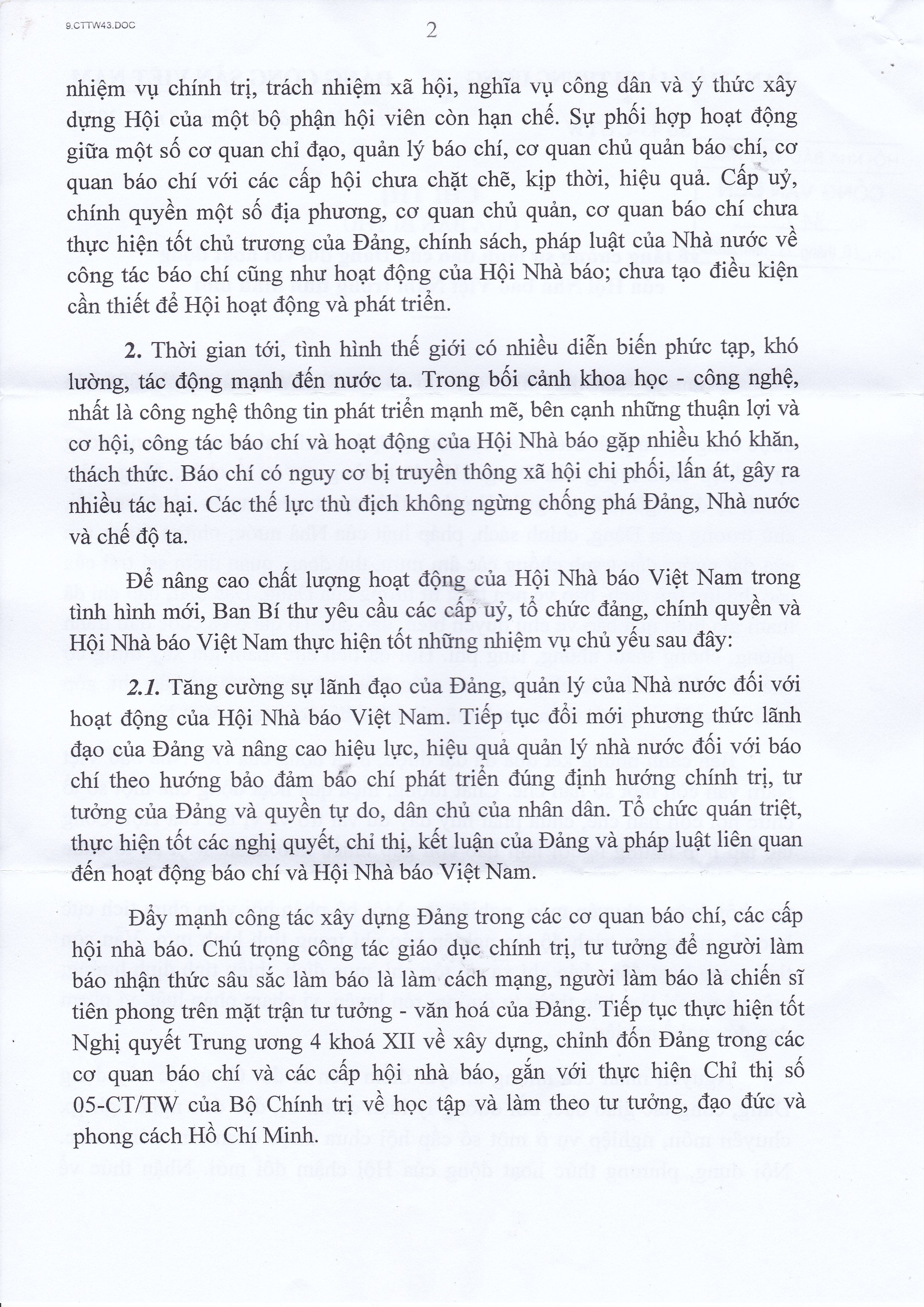 Chỉ thị của Ban Bí thư Trung ương Đảng về tăng cường sự lãnh đạo của Đảng đối với hoạt động của Hội Nhà báo Việt Nam trong tình hình mới