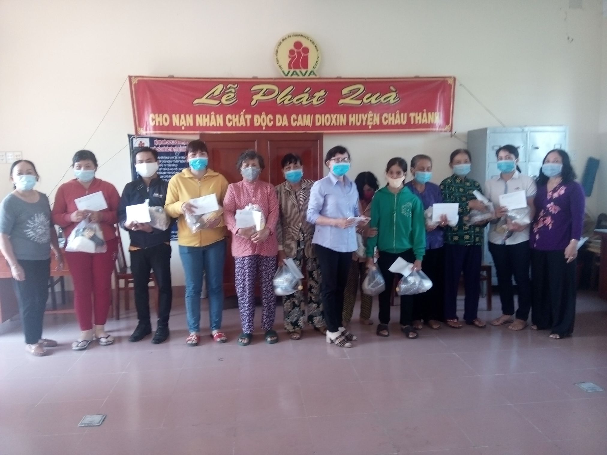 Bà Thu Hồng, Chủ tich Hội NNCĐDC/dioxin tỉnh trao quà cho nạn nhân huyện Châu Thành.