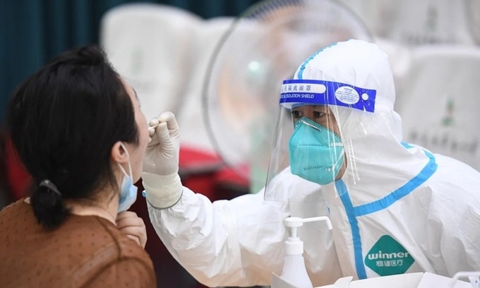 Nhân viên y tế lấy mẫu xét nghiệm Covid-19 cho một người dân ở Nam Kinh. Ảnh: Xinhua.