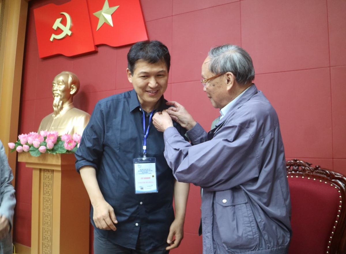 | Chủ tịch Nguyễn Văn Rinh đeo huy hiệu biểu trưng của VAVA cho ông Lee Sanghun |