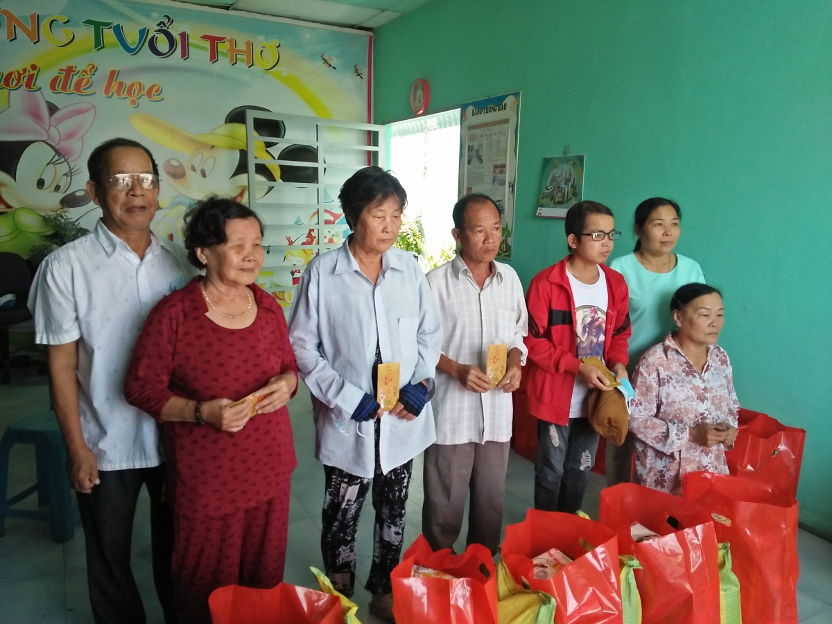 | Ông Sáu Tài (bìa trái) trong một dịp trao quà cho nạn nhân |
