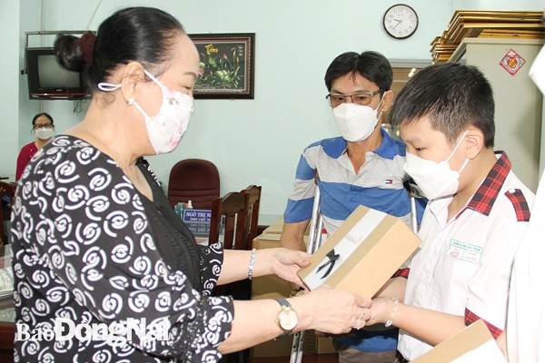 Bà Đào Nguyên, Chủ tịch Hội Nạn nhân chất độc da cam/dioxin tỉnh, trao thiết bị học tập cho con em nạn nhân chất độc da cam/dioxin vào tháng 1-2022. |