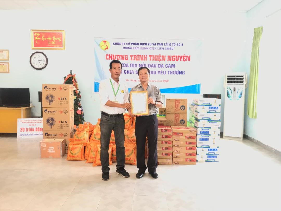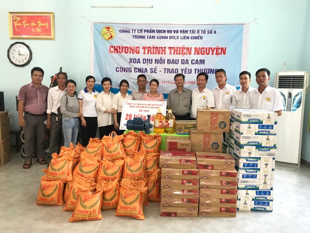 Ngày 14/5/2022, Công ty Cổ phần Dịch vụ và Vận tải Ô tô 6 và Trung tâm Giáo dục nghề nghiệp Đào tạo lái xe Liên Chiểu, thành phố Đà Nẵng đã đến thăm, tổ chức Chương trình thiện nguyện “Xoa dịu nỗi đau da cam, cùng chia sẻ và trao yêu thương” với nạn nhân chất độc da cam đang sinh hoạt, học tập tại Trung tâm Bảo trợ nạn nhân chất độc da cam và Trẻ em bất hạnh thành phố Đà Nẵng. Tại Trung tâm, các em là nạn nhân chất độc da cam cùng nhân viên của đoàn giao lưu ca hát, trò chơi, các hoạt động nhỏ và tặng quà gồm: gạo, dầu ăn, nước mắm, mỳ tôm, sữa vinamill, bánh, kẹo, quạt máy, máy bơm nước.... cho nạn nhân chất độc da cam tại Trung tâm, với tổng trị giá 20 triệu đồng; nhằm đồng hành chia sẻ nỗi đau của nạn nhân da cam, trẻ khuyết tật, đồng thời tạo điều kiện giúp đỡ cho Trung tâm có thêm nguồn lực để chăm sóc, nuôi dưỡng nạn nhân chất độc da cam ngày càng tốt hơn.