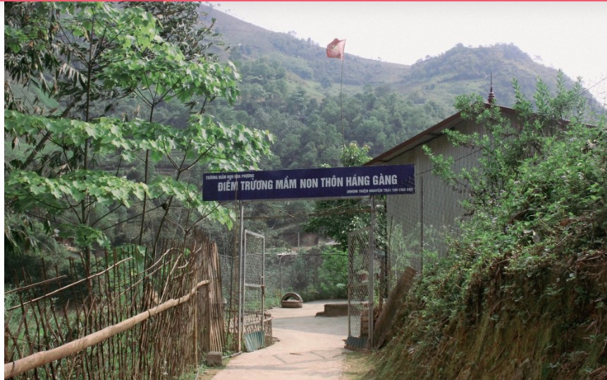 Chúng tôi mất khoảng một tiếng rưỡi đồng hồ đi từ trục đường chính, điểm trường mầm non Háng Gàng nhỏ bé dần hiện ra trước mắt. Xa xa lá cờ tổ quốc tuy có bạc màu nhưng vẫn bay phấp phới đầy phấn khởi hoà vào màu xanh của Háng Gàng. Điểm trường Háng Gàng là một dãy nhà lợp tôn có 3 gian mà khi nắng chiều đổ xuống bóng ngôi trường che vừa đủ khoảng sân nhỏ trước hiên lớp.