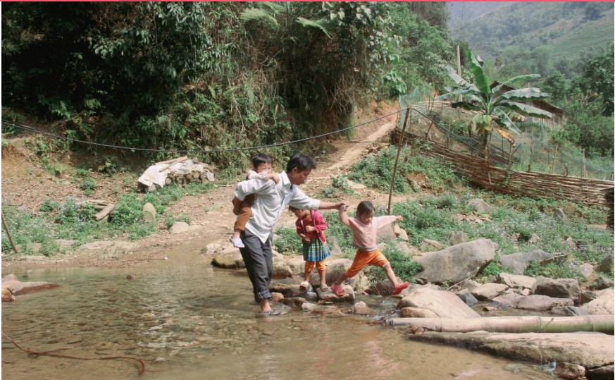 Đường vào điểm trường Háng Gàng phải băng qua nhiều con suối, địa hình khó khăn.